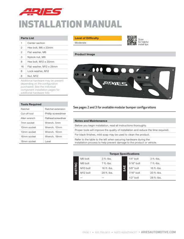 The ARIES TrailChaser Jeep bumper is unlike any other bumper for the Jeep Wrangler JK because it features a modular design. With a variety of options to choose from, you can select the perfect configuration to match the style of your Jeep Wrangler. All TrailChaser bumpers are also compatible with a variety of accessories, including LED lights, D-rings, tow hooks and a Winch. This particular TrailChaser bumper comes with a center section, round center brush guard and corner end caps with flush-mount LED lights. It is constructed from high-strength carbon steel and has a unique, textured black powder coat finish for maximum rust resistance. This same configuration is also available in lightweight, rust-free, powder-coated aluminum. The bumper center section features a standard 22-1/2 in. x 7-3/4 in. Winch housing and is compatible with the ARIES Winch adapter #2072100 for larger w inches. It provides cutouts for lights and has pre-drilled holes for D-rings #2081300 and tow hooks #15600TW. The bumper corners offer a professional finishing touch with their integrated, flush-mount LED lights. The 2 in. square work lights put out 2,200 lumens each and feature a flood beam pattern. They are made with grade-A LED chips, rust-free aluminum construction, an IP68-standard breather and dual heat sinks. They are also thoroughly tested and come with a waterproof wiring harness for easy installation. The round tubular brush guard of this bumper not only adds extra style to your Jeep JK, but it also provides additional light mounting points with two welded tabs along the top. All ARIES TrailChaser bumpers install using pre-existing factory mounting points for fast, easy installation with no drilling required.