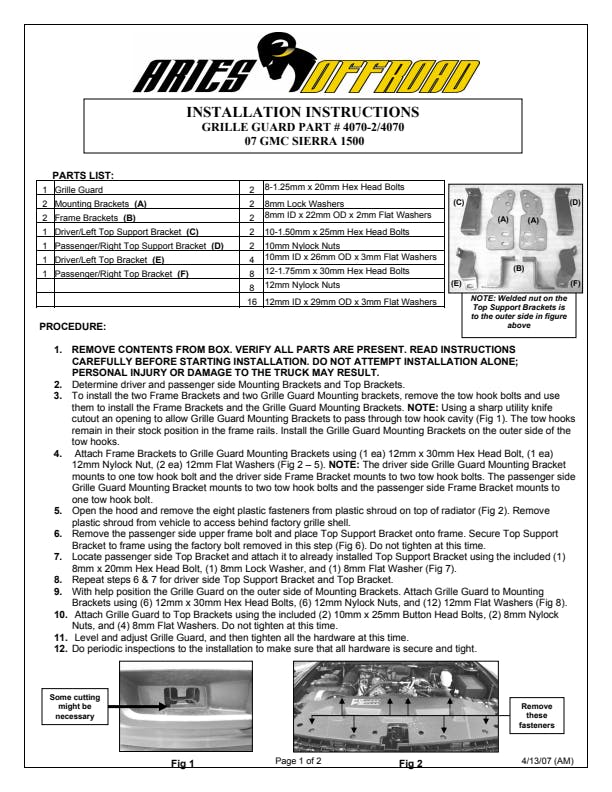 For the conqueror in every truck, Jeep or SUV owner, the ARIES grille guard offers the tough, trail-ready look you demand. It begins with a one-piece frame of 1/4 in. thick welded plates and 1-1/2 in. mandrel-bent tubing for a solid build. Each one is made with a vehicle-specific design for a better fit, easier install and more secure mounting. The side brush guards are custom-bent to contour to the profile of your vehicle, while the mounting brackets are positioned for a no-drill application. This means pre-existing factory holes are used to ensure optimum fitment and less vibration. This particular custom grille guard fits specific years of the GMC Sierra 1500 (see application info to verify). The ARIES grille guard also makes it easy to customize the look of your vehicle. Not only does the crossbar have two pre-drilled holes for mounting aftermarket LED lights, but many of our grille guards are also available in two finish options polished stainless steel or semi-gloss black steel. The stainless steel grille guard is made with 304 stainless, being high in nickel content and truly resistant to rust and corrosion. This option comes with a mirror-like polished finish for a definitive shine. The semi-gloss black grille guard is made with high-strength carbon steel for added strength. It features a tough, dual-layer E-coat and black powder coat finish to protect against rust, scratches and the elements. All ARIES grille guards also come with rubber stripping along the risers to protect the frame against scuffs and scratches.