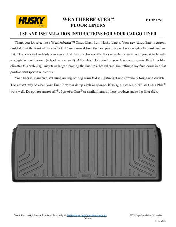 The original all-weather liner is ready, come hell or hot coffee. The Weatherbeater?s construction is a no-slip zone with zero edge curl, and its Stay Put Nibs keep it firmly anchored underfoot. It stands up to chemicals like gas, oil and battery acid, and stays tough and flexible, even under extreme temperatures. Its laser-scanned, FormFit Design? gives your truck, van or SUV an ultra-clean look with easy cleanup to match, while its patented, FormFit Edge? keeps spills contained, carpets unstained. It?s unbeatable Husky protection for life, warrantied the same. Proudly made in the USA.