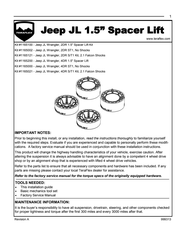 Even when reality demands that you keep your JL Wrangler Unlimited family friendly, TeraFlex will satisfy your primal need to go big. The TeraFlex JL 4dr: 1.5" Performance Spacer Lift Kit allows you to run larger tires with added clearance on the trail, all while maintaining family-friendly versatility. This kit also corrects the factory rake to give your JL Wrangler Unlimited some attitude thanks to a more aggressive stance. Not only does the 1.5" Performance Spacer Lift Kit clear larger tires, but the additional height helps compensate for heavier aftermarket bumpers and winch, a larger spare tire, or weekend gear. . Does NOT include shocks. We recommend Falcon Performance SP2 Mode Adjust Shocks or TeraFlex 9550 VSS Twin-Tube Shocks. These are the only shock absorbers engineered to work with TeraFlex lift coil spring spacers to improve both compression and rebound for optimal vehicle stability. 1.5" Performance Spacer Lift Kits are offered without shock absorbers. Works with stock length shock absorbers Falcon Performance Shocks and TeraFlex 9550 VSS Shocks are available separately.